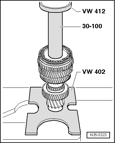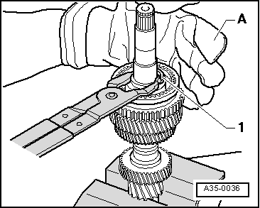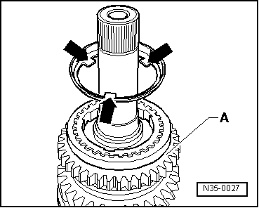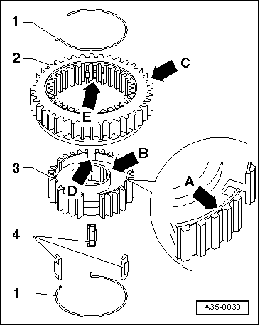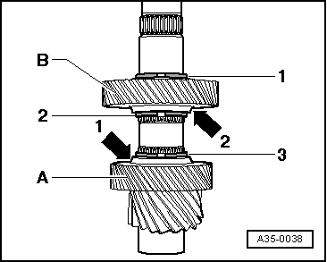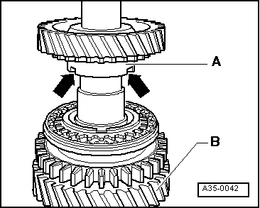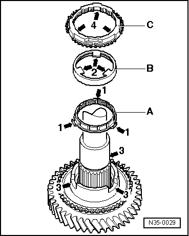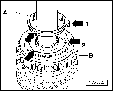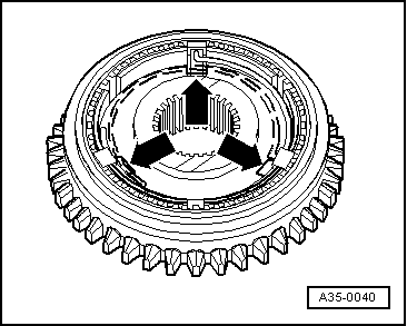 | Ne pas intervertir les bagues de synchroniseur ; en cas de réutilisation, veiller à toujours faire l'appariement avec le pignon baladeur initialement en place. |