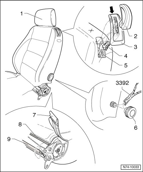 | - | À l'aide de la pince de démontage -3392-, déposer la molette de réglage -6- du réglage en hauteur de l'appui lombaire. |