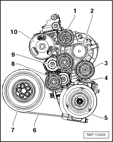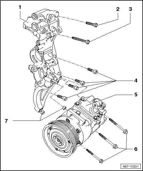 | - | Désolidariser le compresseur de climatiseur en dévissant les vis six pans -6-. Retirer le compresseur de climatiseur du support d'organes auxiliaires et le fixer sur la carrosserie à l'aide d'un auxiliaire approprié (par ex. avec un fil de soudage) → fig.. |
