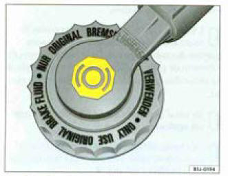 II est impératif de faire effectuer la vidange du liquide de frein conformément aux indications figurant dans le Plan d`Entretien. Faites effectuer la vidange du liquide de frein par un spécialiste. Volkswagen vous recommande pour cela le Partenaire Volkswagen. Faites l'appoint avec le nouveau liquide de frein uniquement.
