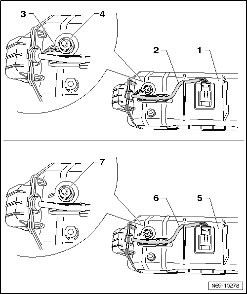 Nota| Si nécessaire, prolonger le câble de masse en utilisant les moyens adéquats du coffret de réparation des faisceaux électriques -VAS 1978- ou du coffret de réparation des faisceaux électriques -VAS 1978A-. |
