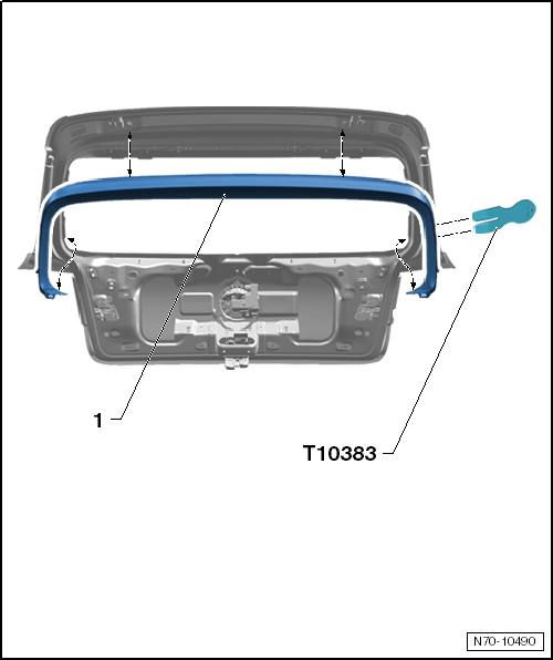 | - | À l'aide de la cale -T10383 -, détacher les côtés du revêtement -1- des logements situés dans le hayon. |
