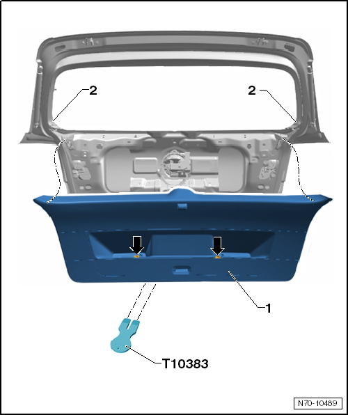 | - | À l'aide de la cale -T10383-, détacher le revêtement -1- des logements situés dans le hayon. Commencer par le bord inférieur du hayon. |