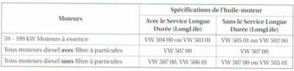 N'utilisez si possible que de l'huile-moteur agréée par Volkswagen. Si vous souhaitez maintenir le Service Longue Durée (LongLife), vous devez faire l'appoint uniquement avec l'huile spécialement homologuée pour le Service Longue Durée conformément à la norme VW correspondante. Les huiles-moteurs mentionnées sont des huiles multigrades superlubrifiantes.